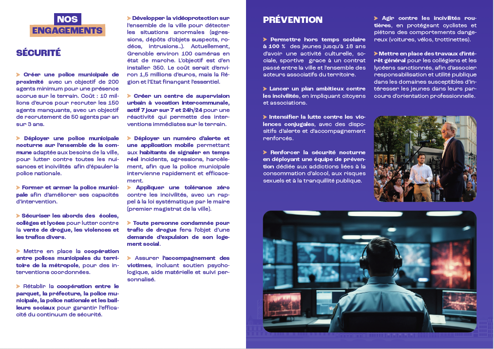 Une vision globale : prévention, sanction, action Ce programme repose sur une idée simple : agir en amont, intervenir rapidement, sanctionner efficacement. La sécurité, c’est aussi de la prévention :Accès à des activités culturelles, sportives et sociales pour tous les jeunes jusqu’à 18 ans, soutien aux associations, implication des habitants dans la lutte contre les incivilités.